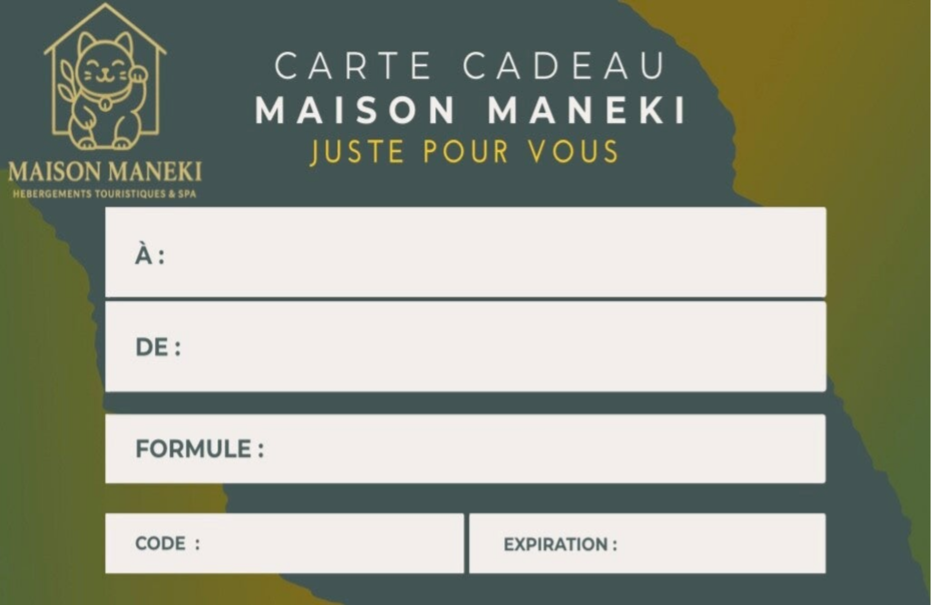 Faites plaisir à vos proches avec nos cartes cadeaux pour un séjour inoubliable chez Maison Maneki. Offrir une carte cadeau, c'est bien plus qu'un simple présent : c'est l'opportunité de partager une expérience unique, un moment de détente et de bonheur dans un cadre chaleureux et authentique. Adaptés à toutes les occasions, nos cartes cadeaux permettent de créer des souvenirs précieux et inestimables. Faites confiance à Maison Maneki pour offrir une parenthèse enchantée à ceux qui comptent le plus pour vous.